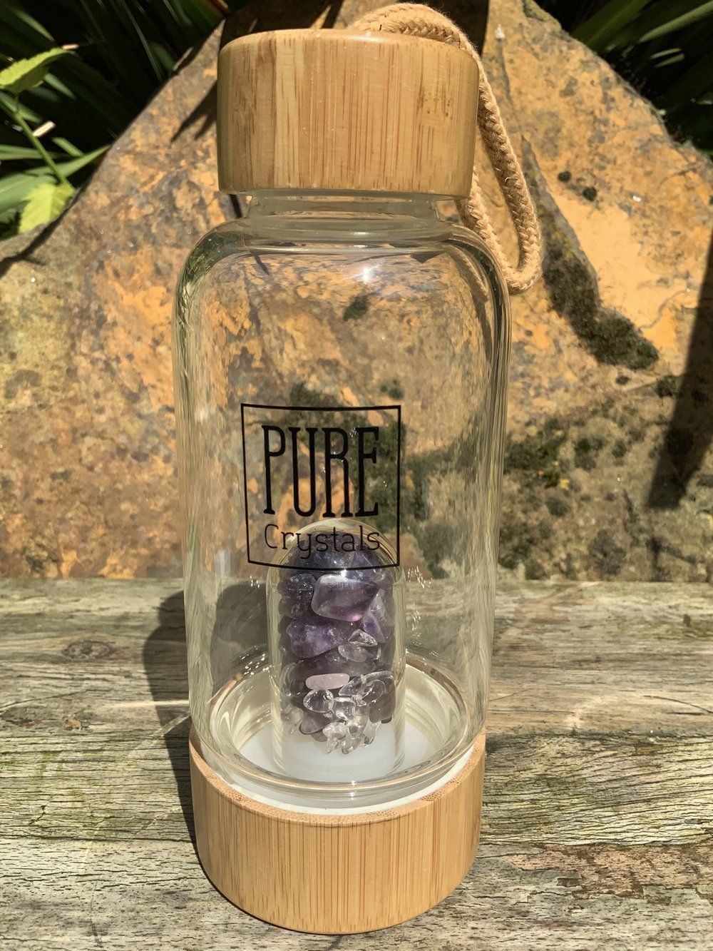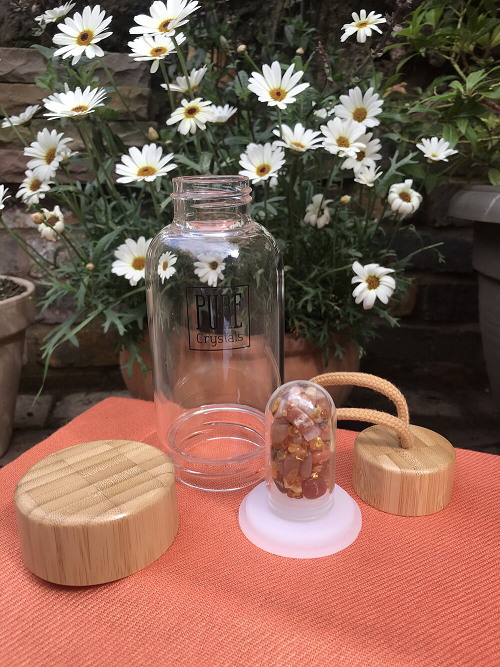 Fill your PURE Crystals Glass Water Bottle up with water. Place the bamboo lid onto the top of the bottle, leave for 7 – 10 minutes. During this time the healing vibrations of your chosen crystals are being absorbed into your water, ready for you to enjoy.